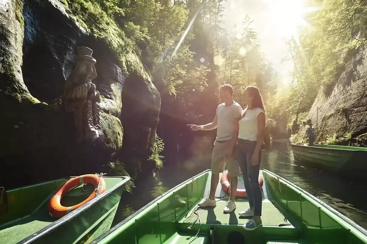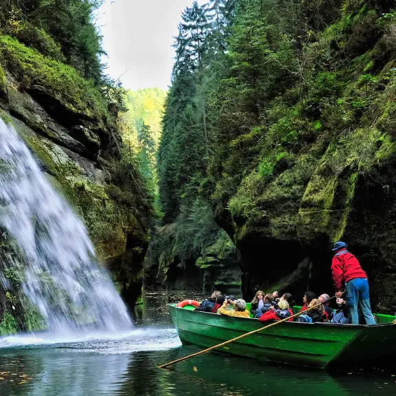 Enjoy a traditional boat ride through the narrow sandstone canyon of the Kamenice Gorge.