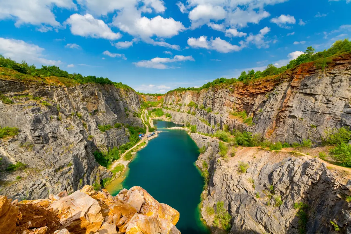 Discover the breathtaking Great America Quarry! This massive limestone canyon, often called the Czech Grand Canyon, boasts steep cliffs, crystal-clear waters, and sweeping panoramic views. A perfect spot for stunning photos and a moment to soak in the natural beauty of this hidden gem.